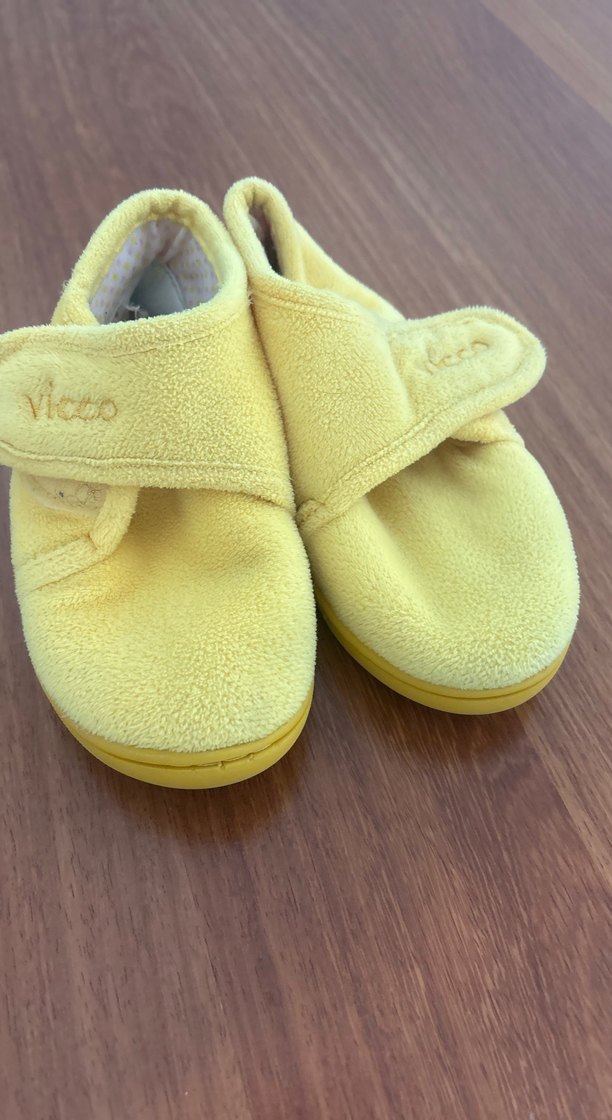 Kız çocuklar için sarı polar ev terliği, Velcro bantlı, sıcak ve rahat, sade ve renkli tasarımda.