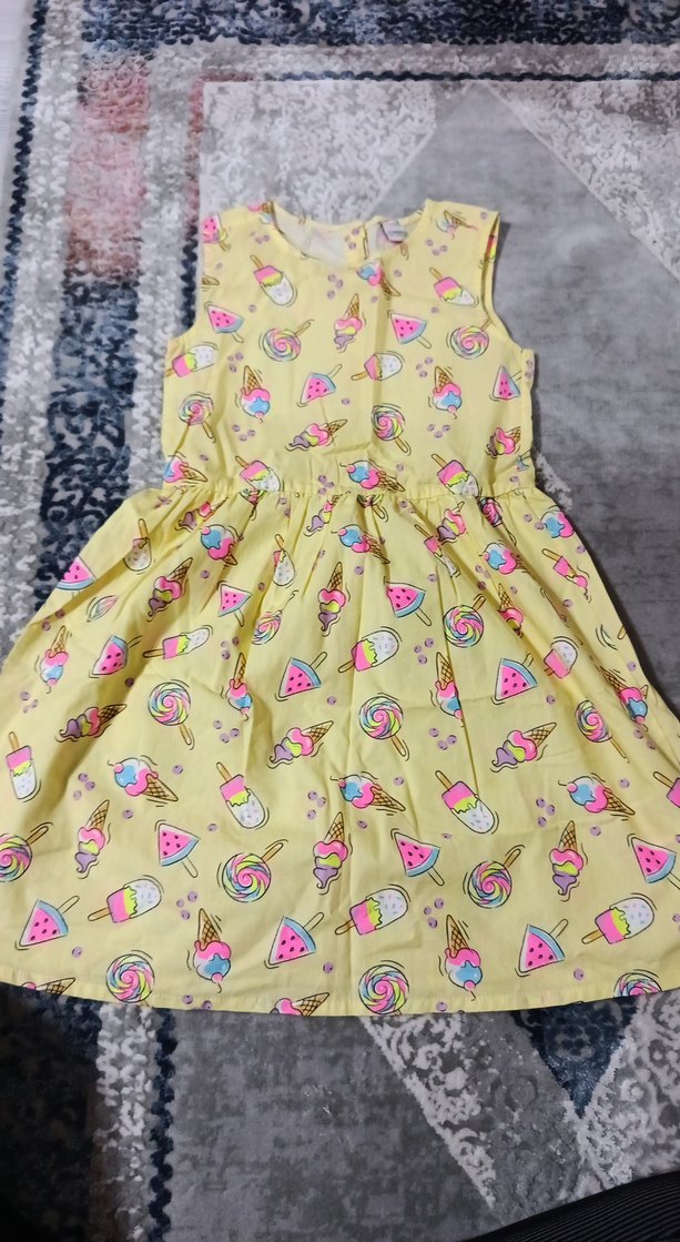 Kız çocukları için sarı renkli, kolsuz, dondurma ve şeker desenli, bol kesim ve fırfır detaylı elbise. Rahat ve günlük kullanım için uygun.