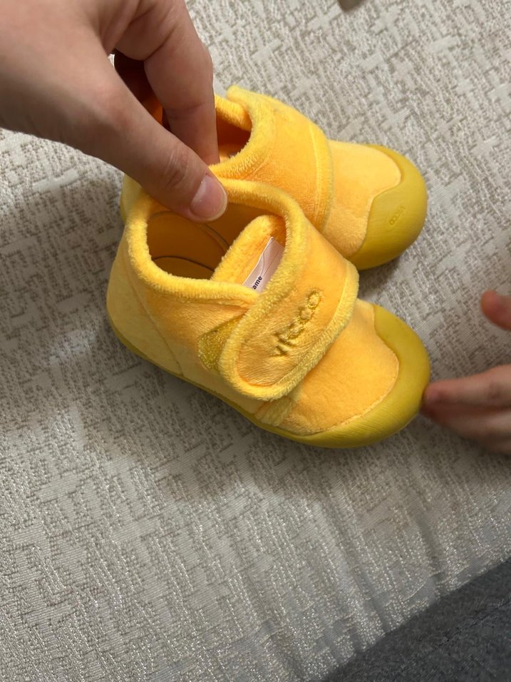 Kız çocukları için sarı renkte, yumuşak kumaşlı, cırt cırtlı ve dayanıklı kauçuk tabanlı sıcak terlikler.