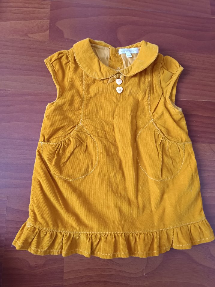 Kolsuz, yakalı ve fırfırlı detaylara sahip kız çocuk elbisesi, yumuşak süet kumaştan yapılmıştır. Canlı sarı renkte, bol kesim ve bohem tarzda, kalp şeklinde düğmeler bulunur. ( marka LCW değildir)