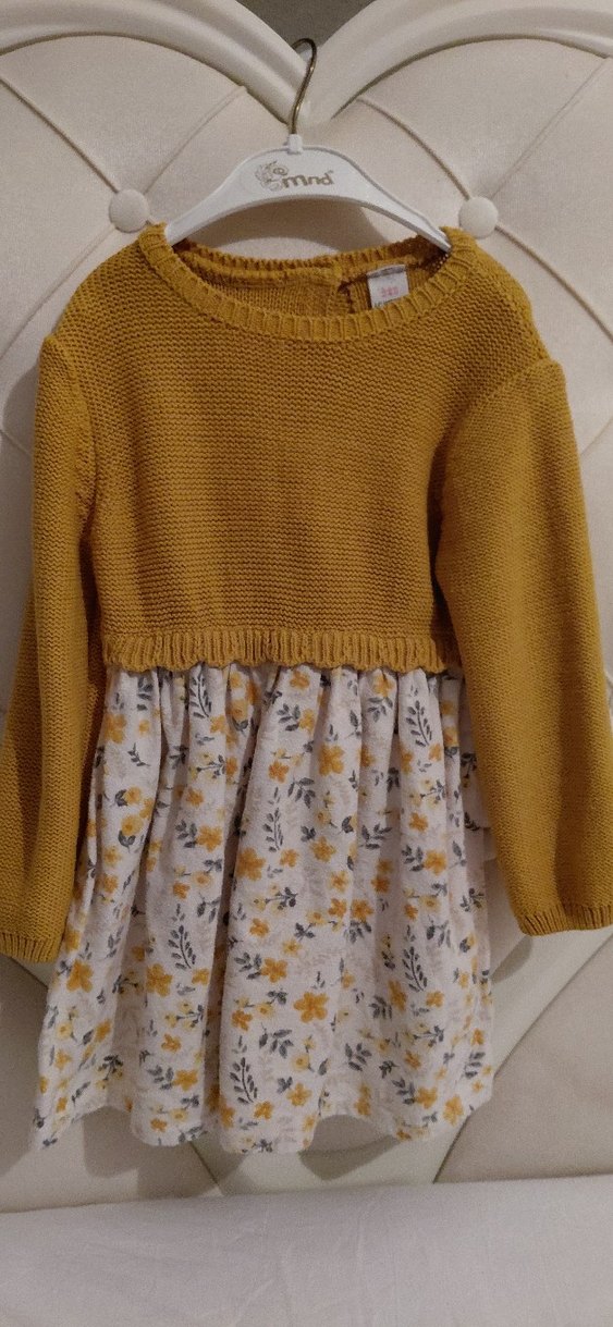 Bohem tarzda, sarı uzun kollu triko üst ve çiçek işlemeli etek kısmı olan bol kesim kız çocuk elbisesi. problemsiz