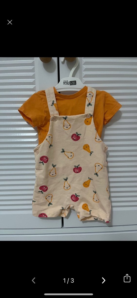 Pamuklu, bol kesim, kısa kollu, meyve desenli kız tulumu. Canlı sarı renkli örme tişört ile tamamlanmıştır.