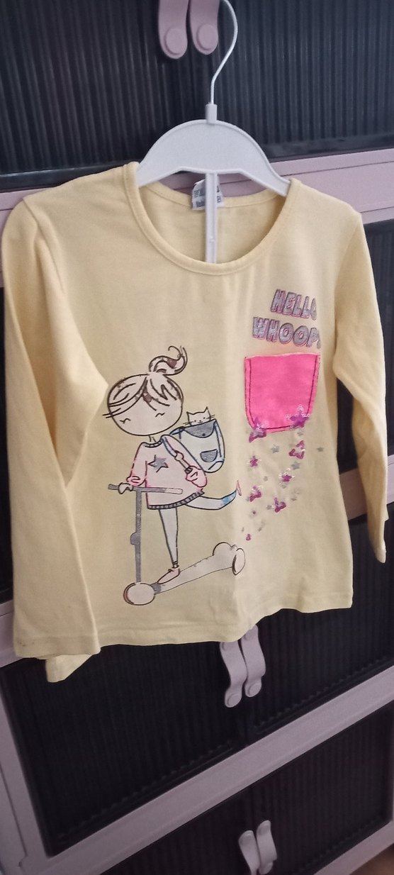 Sarı, uzun kollu pamuklu kız çocuk tişörtü; bol kesim, baskılı tasarımda scooter binen kız ve cırt cırtlı pembe detay bulunur. Yuvarlak yaka rahatlık sağlar.