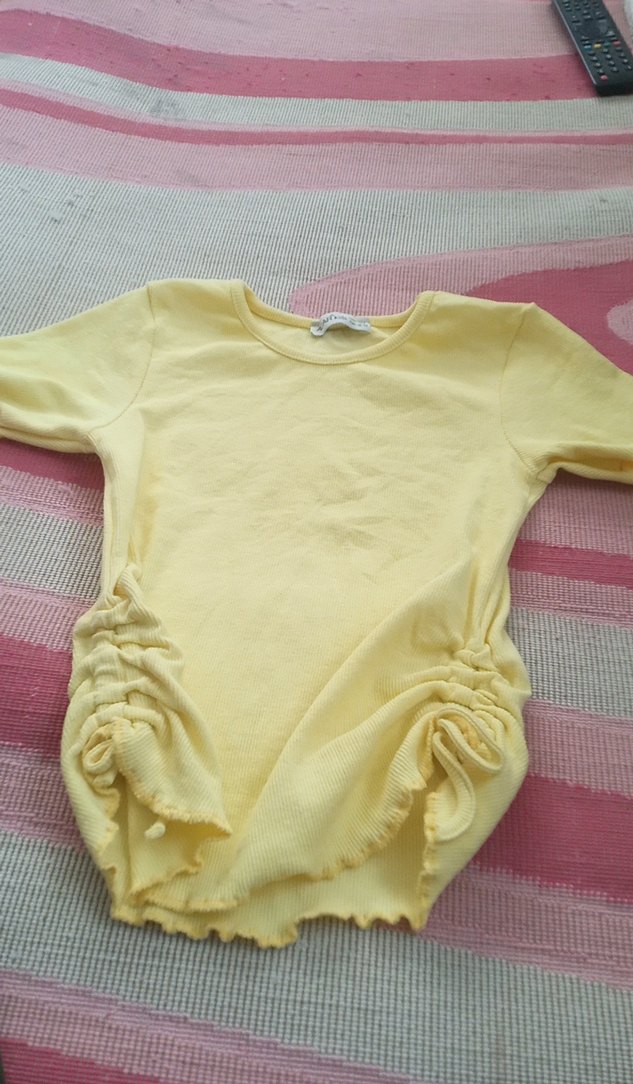 Fitted kesim, uzun kollu, bisiklet yaka ve fırfır detaylı sarı keten kız çocuk tişörtü. Pastel tonu ve sade tasarımıyla trend ve rahat bir seçenek.