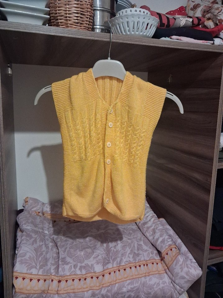 Kız çocukları için sarı, örgü, kolsuz, V yaka ve düğmeli ön kapamalı, vücuda oturan süveter. Parlak dokusu bohem tarzı yansıtıyor.