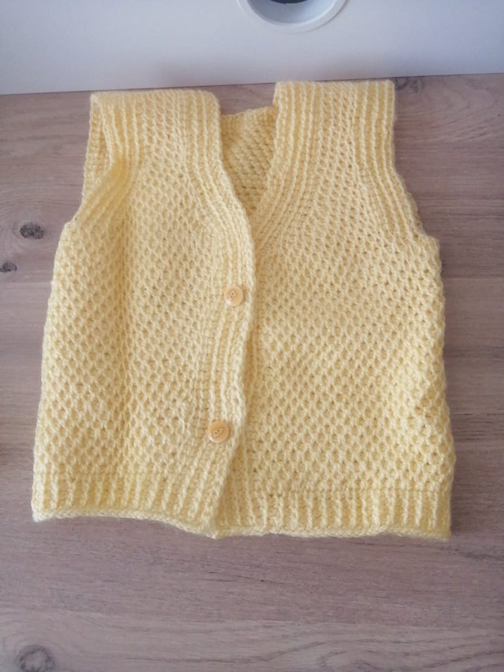 Kız çocuklar için sarı, V yaka, düğmeli, örgü yelrk Kolsuz, düz ve pastel tonlarda, vücuda oturan kesime sahip. yeni yapıldı hiç kullanılmamış
