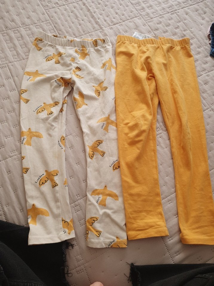 İki adet kız çocuk taytı, biri düz sarı diğeri sarı kuş desenli beyaz. Her ikisi pamuklu, bol kesim ve sokak stiline uygun.