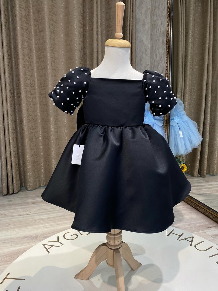 Kız Çocuk Saten Siyah Balon Kollu Elbise