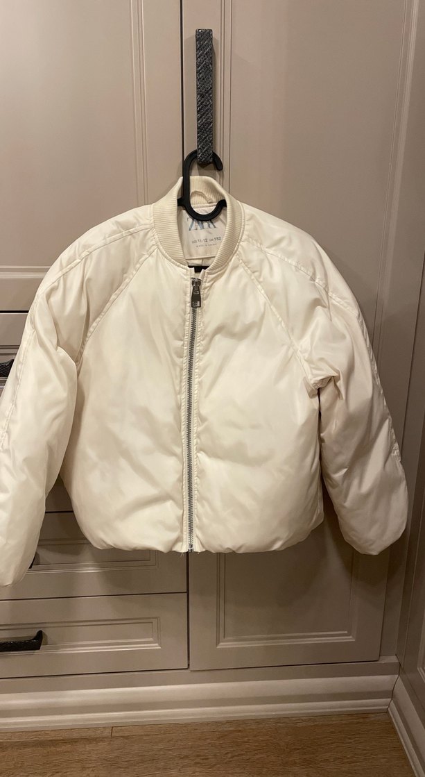 Kırık beyaz, fermuarlı, uzun kollu, bomber tarzı mont. Hiç giyilmedi.