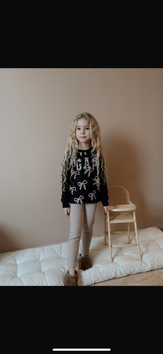 Siyah bağlamalı desenli, uzun kollu kız çocuk sweatshirtü, klasik yuvarlak yakalıdır.
