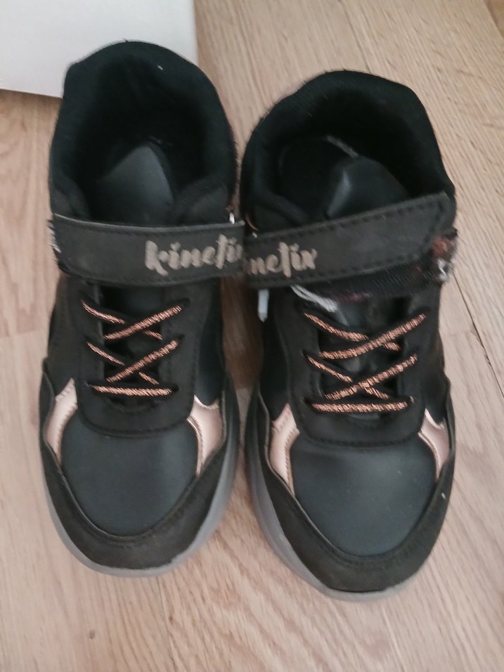Kız çocukları için siyah bantlı ve gold detaylı, kauçuk tabanlı spor ayakkabılar. Sokak stili ve trend görünüm için uygundur.