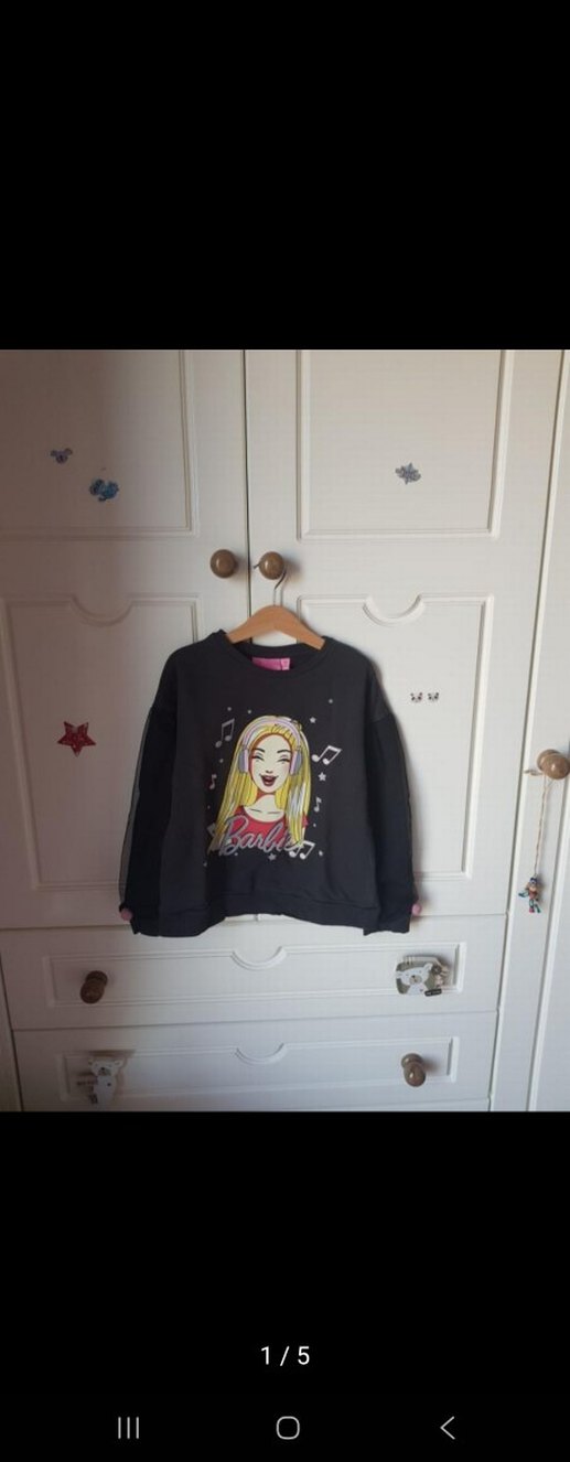 Kız çocukları için siyah renkli, bol kesim, uzun kollu ve yuvarlak yakalı sweatshirt. Yumuşak, sıcak dokulu örgü kumaştan yapılmıştır ve Barbie baskısı vardır.