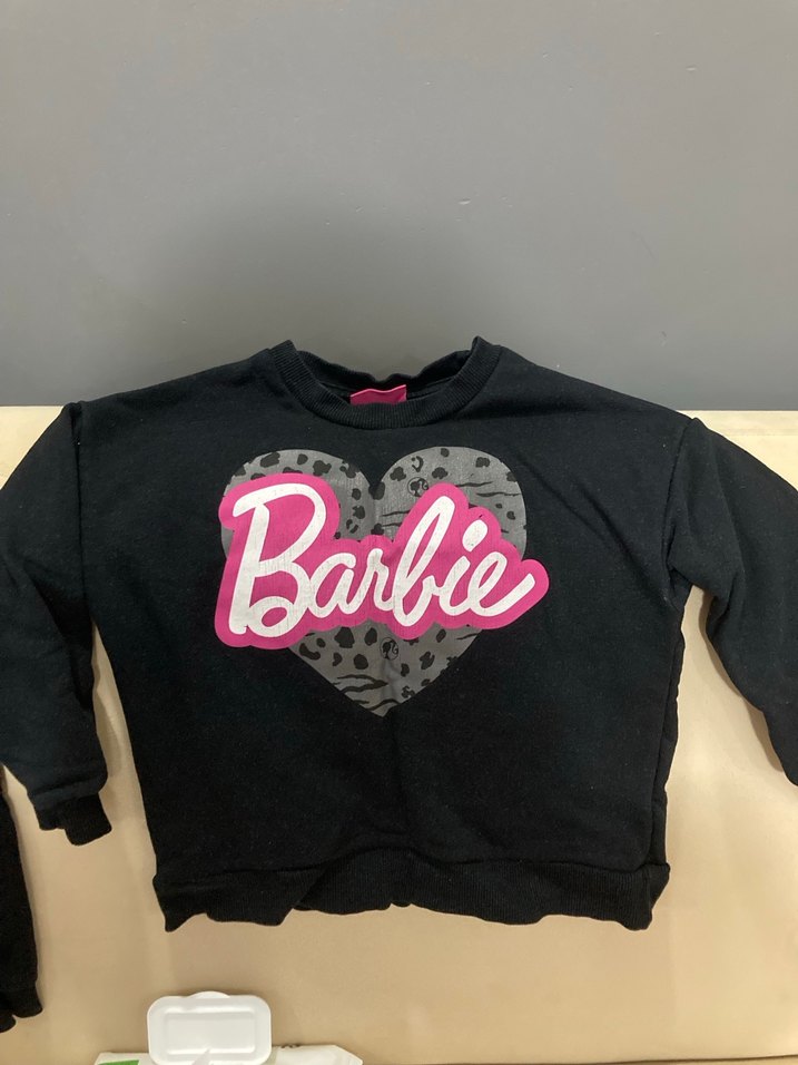 Siyah renkli kız çocuk sweatshirtü, uzun kollu ve yuvarlak yaka. Barbie baskılı kalp deseniyle dikkat çeker. Yumuşak ve rahat dokuda, bol kesim ve örme detaylıdır.