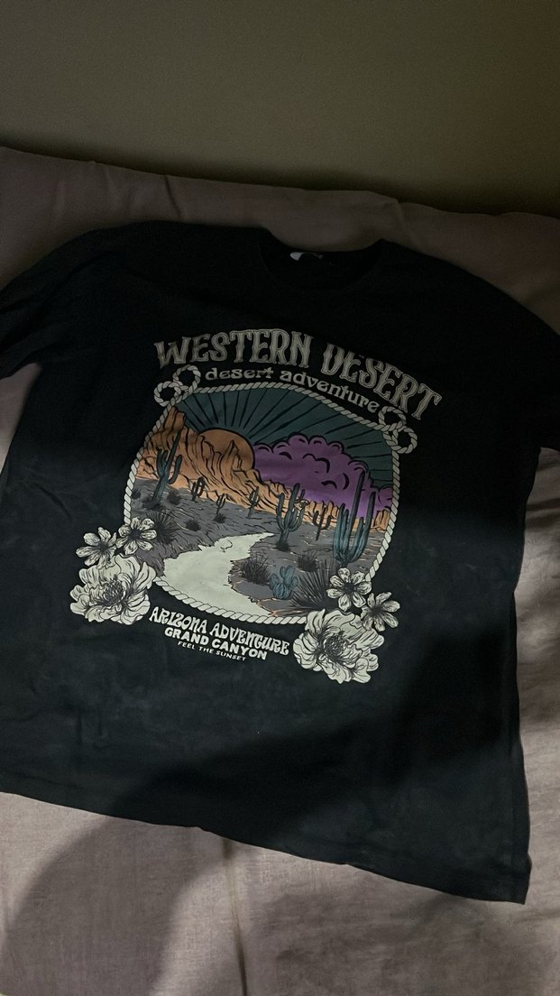 Pamuklu siyah tişört, kısa kollu, bohem tarzda baskılı ve bol kesimdir. Yuvarlak yakalıdır ve rahat bir görünüm sunar.