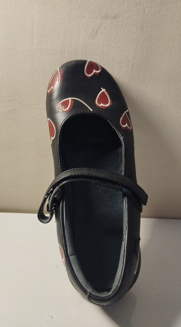 Siyah kauçuk babet, baskılı kalp deseni ve tokalı bant ile gotik tarzda şık bir görünüme sahip.