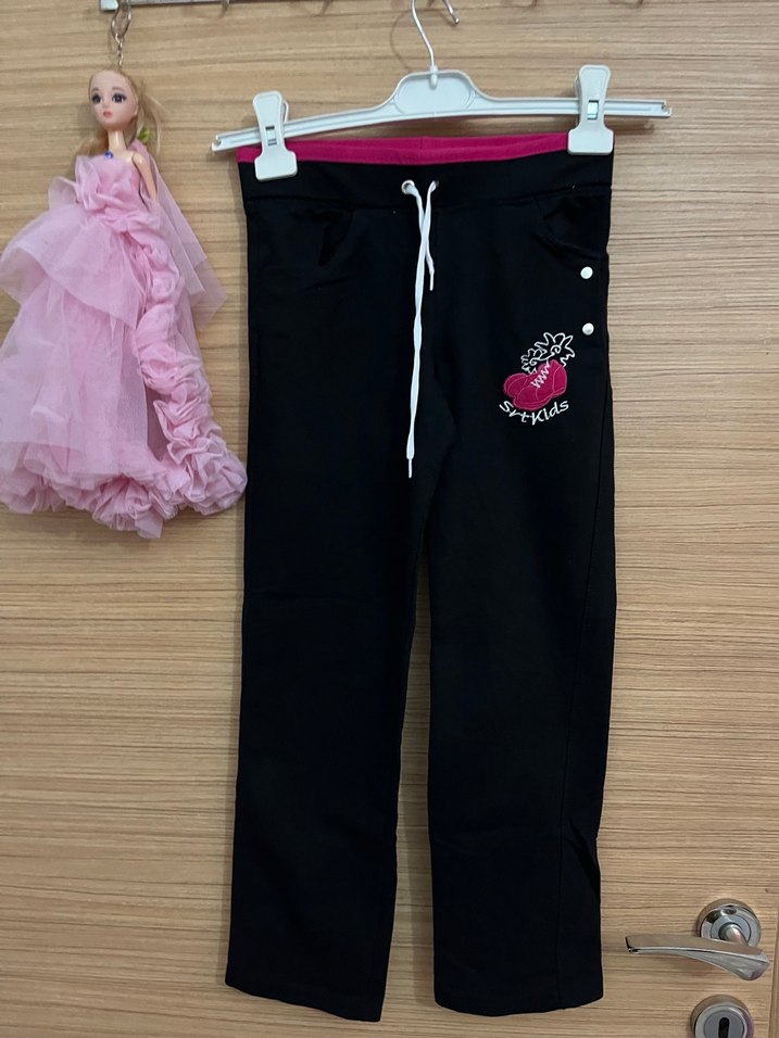 Kız çocukları için siyah baskılı, kemerli ve rahat kesimli eşofman altı. Yumuşak ve sıcak kumaştan, sokak modasına uygun.