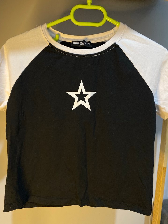 Pamuklu, kısa kollu, bisiklet yaka, fitted kesim siyah tişört, önünde beyaz yıldız baskısı ile rock punk tarzını yansıtıyor.