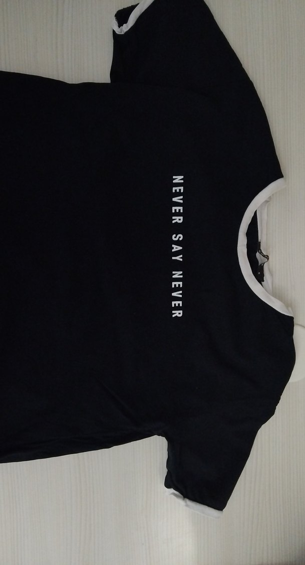 Siyah, baskılı "NEVER SAY NEVER" yazılı, kısa kollu, bisiklet yaka, sentetik kumaştan kız çocuk tişörtü. Velcro detaylı ve dar kesim.