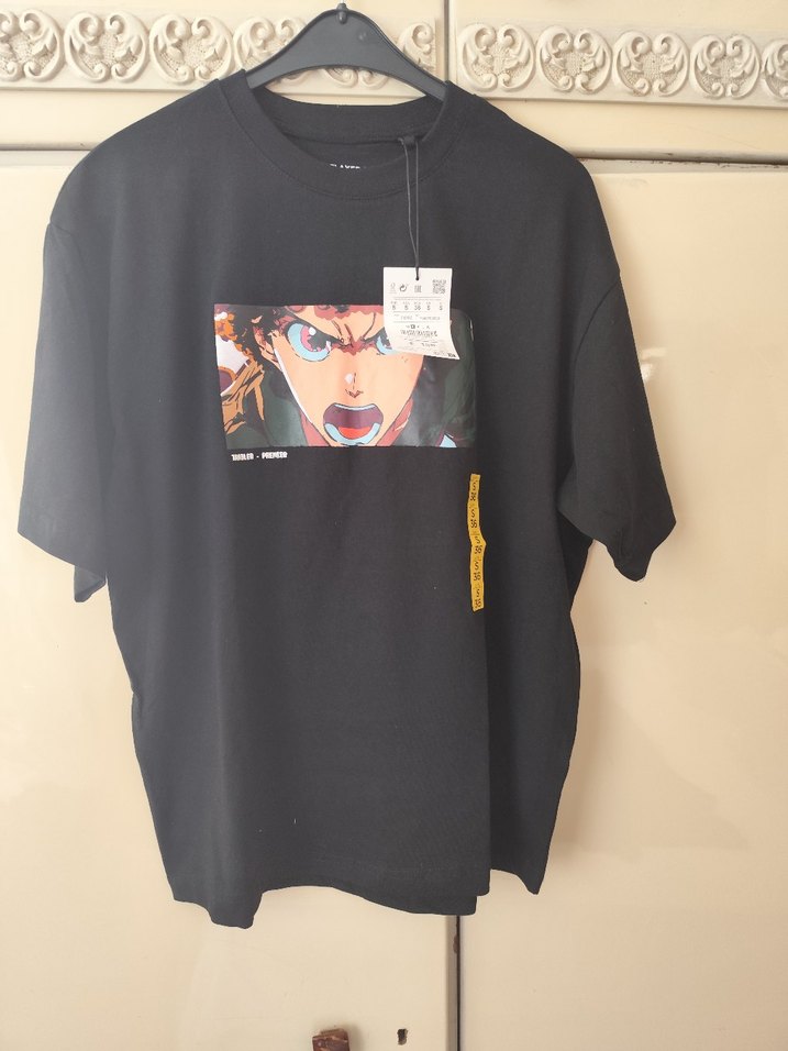 Kız çocukları için siyah, baskılı, kısa kollu, yuvarlak yaka, bol kesim tişört. Yumuşak sentetik kumaştan üretilmiştir.