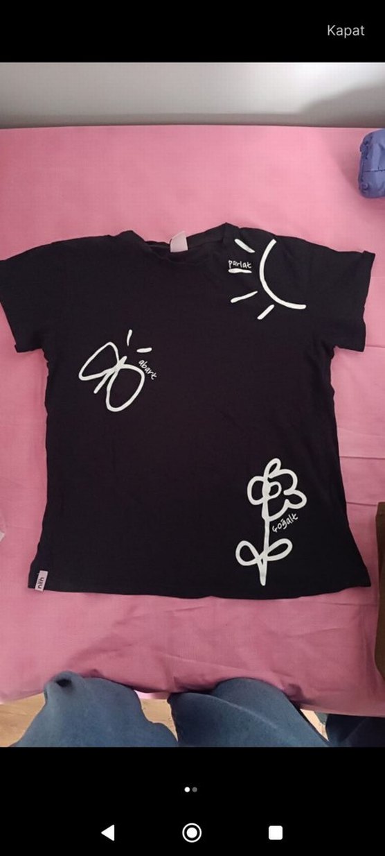 Pamuklu siyah tişört, kısa kollu ve yuvarlak yakalıdır. Güneş, kelebek ve çiçek baskılarıyla rahat ve şık bir görünüm sunar.