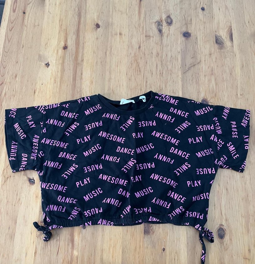 Kısa kollu, salaş kesim siyah kız çocuk tişörtü, pembe baskılı kelimelerle süslenmiş, bisiklet yaka ve sokak stili.