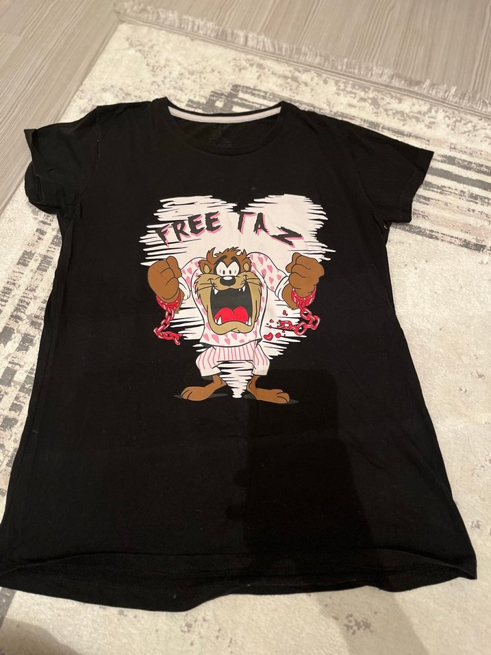 Pamuk kumaştan yapılmış siyah renkli, puf kollu ve bol kesim kız çocuk tişörtü. Yuvarlak yaka ve baskılı, rock punk tarzı desen içerir.