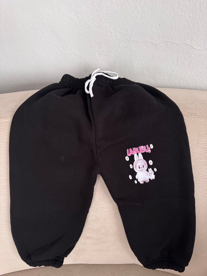 Kız çocukları için siyah renkli, baskılı, rahat kesim eşofman altı. Yumuşak ve sıcak kumaş, velcro detayı ve uzun kollu tasarım içerir.
