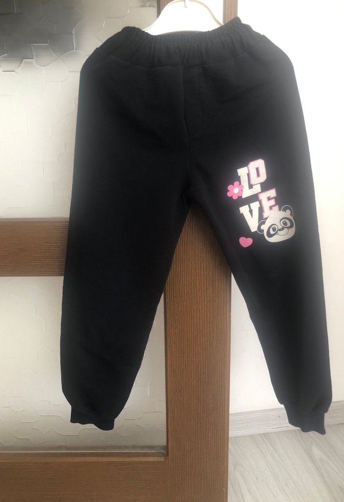 Rahat kesim siyah kız çocuk pantolonu, "LOVE" yazısı ve panda baskılı. Yumuşak ve sıcak kumaştan, ayarlanabilir cırt cırtlı detaylı. Günlük sokak stili için uygun. 5-6 yaş