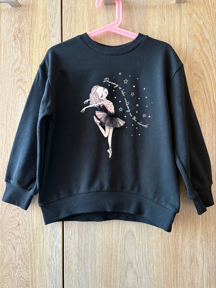 Kız çocukları için yuvarlak yaka, uzun kollu, bol kesim siyah sweatshirt. Yumuşak ve sıcak kumaştan, baskılı balerin figürü ve örgü detaylıdır.