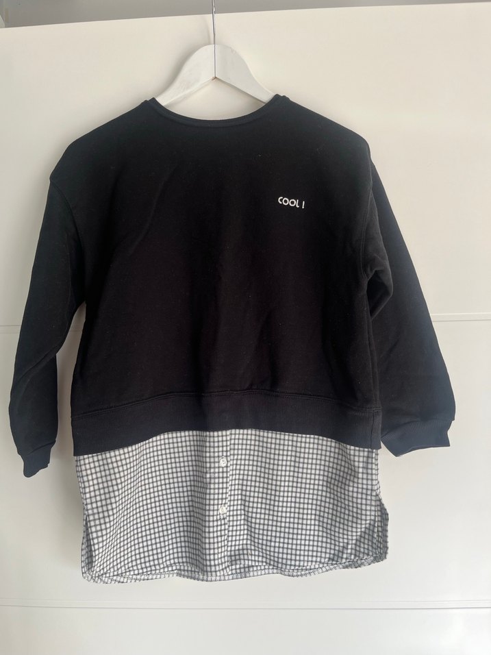 Kız çocuk için uzun kollu, bisiklet yaka, bol kesim siyah pamuk sweatshirt. Alt kısmı baskılı ve düğmeli detaylı, rahat sokak stili için uygun.
