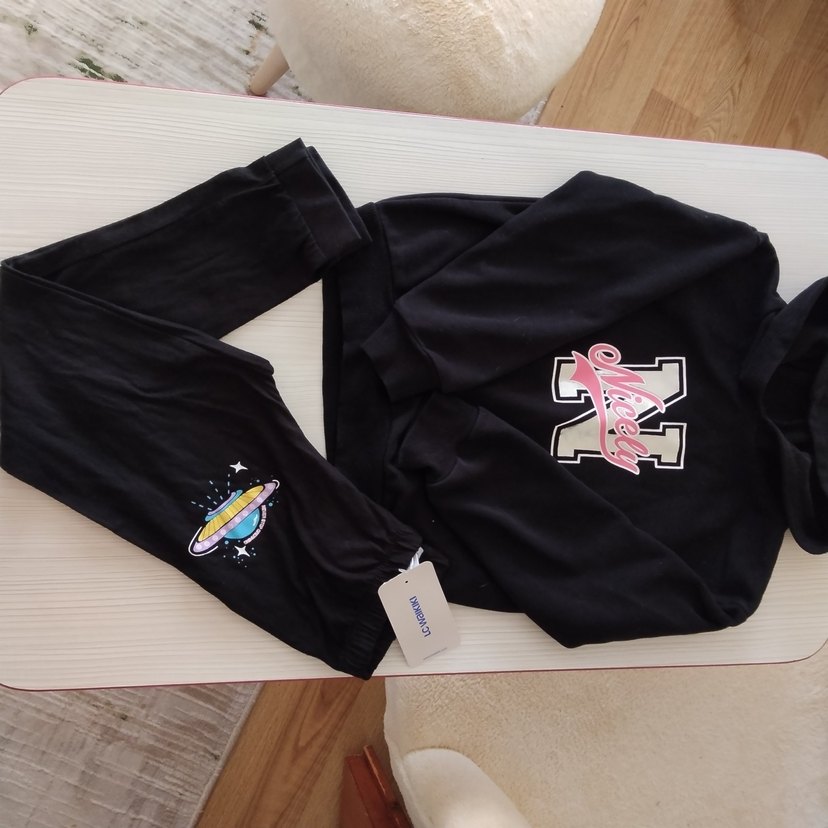 Kız Çocuk Siyah Baskılı Sweatshirt ve Eşofman tayt