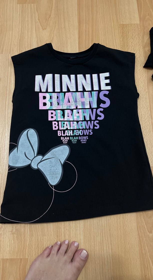 Pamuklu, siyah renk, baskılı Minnie desenli, bol kesim, kısa kollu kız çocuk tişörtü, fiyonk detayıyla trendy tarz sunar.