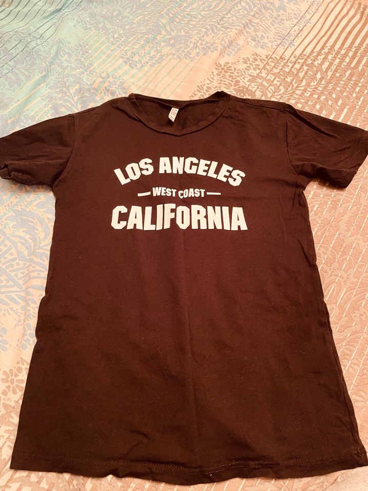 Kız çocuk siyah tişört, kısa kollu ve bol kesimdir. Pamuklu kumaştan yapılmış, bisiklet yaka ve "Los Angeles, West Coast, California" baskısı vardır.