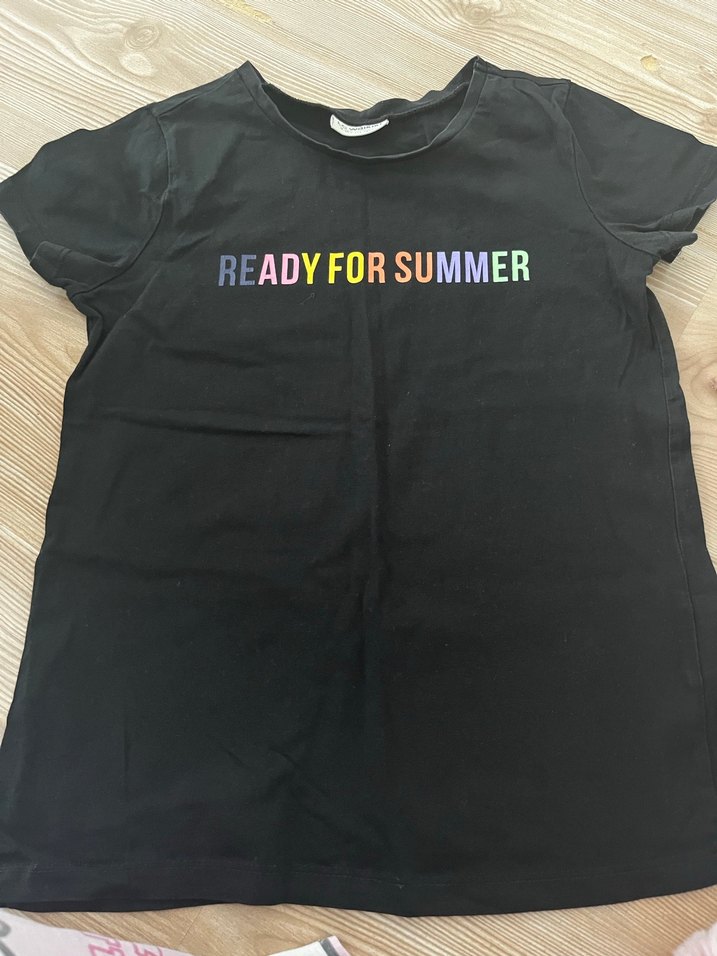 Kısa kollu, dar kesim siyah kız çocuk tişörtünde renkli "READY FOR SUMMER" baskısı bulunur.