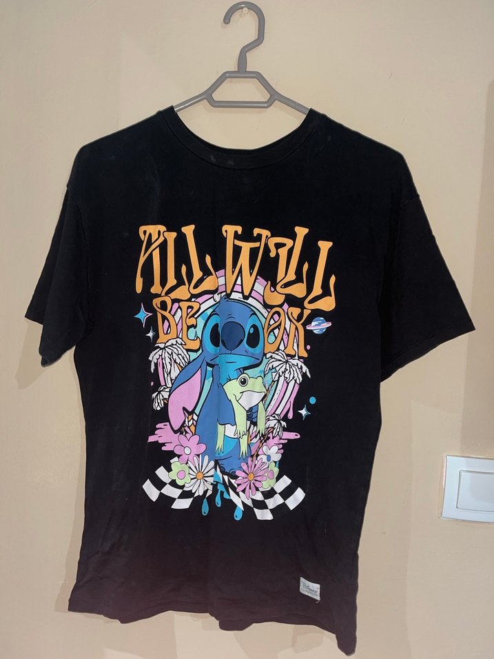 Siyah pamuklu, bol kesim tişört, baskılı renkli çizgi film karakteri ve çiçek detaylarıyla rock punk sokak tarzına uygun.