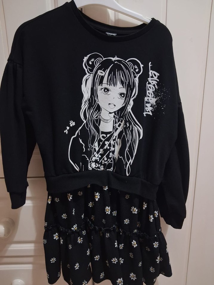 Siyah, bol kesim kız çocuk elbisesi, uzun kollu ve bisiklet yaka. Gotik tarz baskı ve fırfır detaylı, sentetik yumuşak kumaştan üretilmiştir.