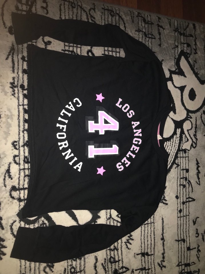 Sentetik kumaştan, salaş kesim, uzun kollu siyah tişört. Üzerinde "41 LOS ANGELES CALIFORNIA" baskısı bulunur.