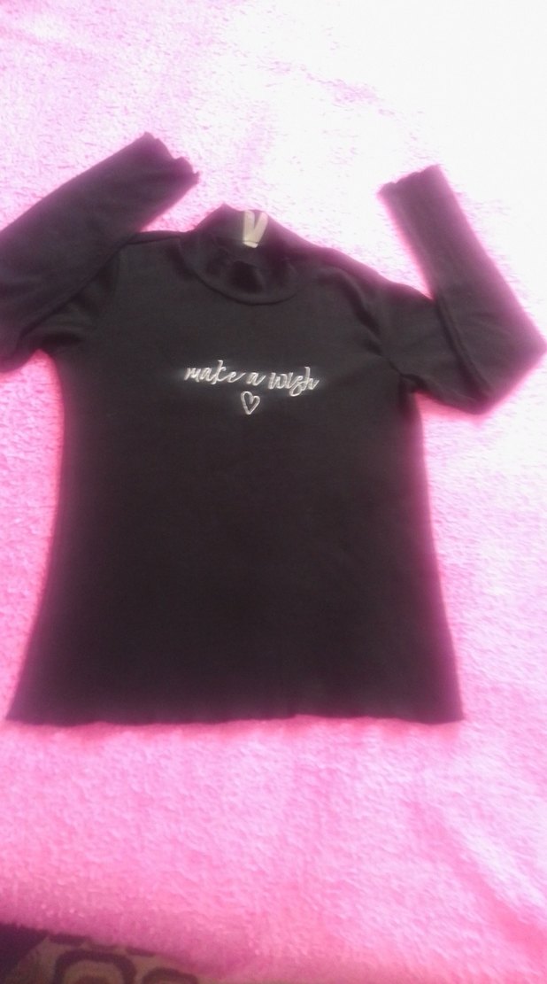 Pamuk kumaştan yapılmış, yüksek yakalı ve baskılı "make a wish" yazılı siyah, uzun kollu, fitted kesim kız çocuk tişörtü. Trendy ve zahmetsiz şıklık sunar. ışıktan dolayı renk soluk çıkabiliyor hiçbir sıkıntı yok sıfırdan farksız