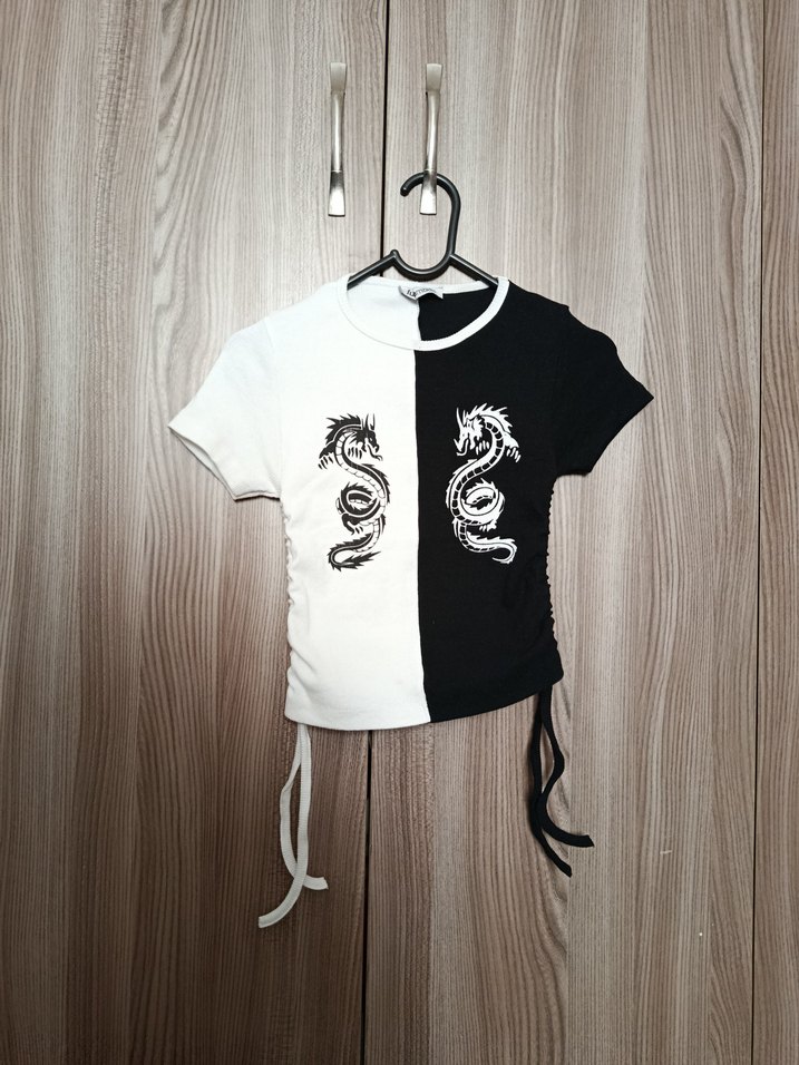 Kısa kollu, bisiklet yaka kız çocuk tişörtü, siyah beyaz renk bloklu, ejderha baskılı ve yan kemer detaylıdır. Trendy casual uyumlu, dokuma kumaş. alt kısımda belirsiz bir leke var son fotoğrafta görebilirsiniz.