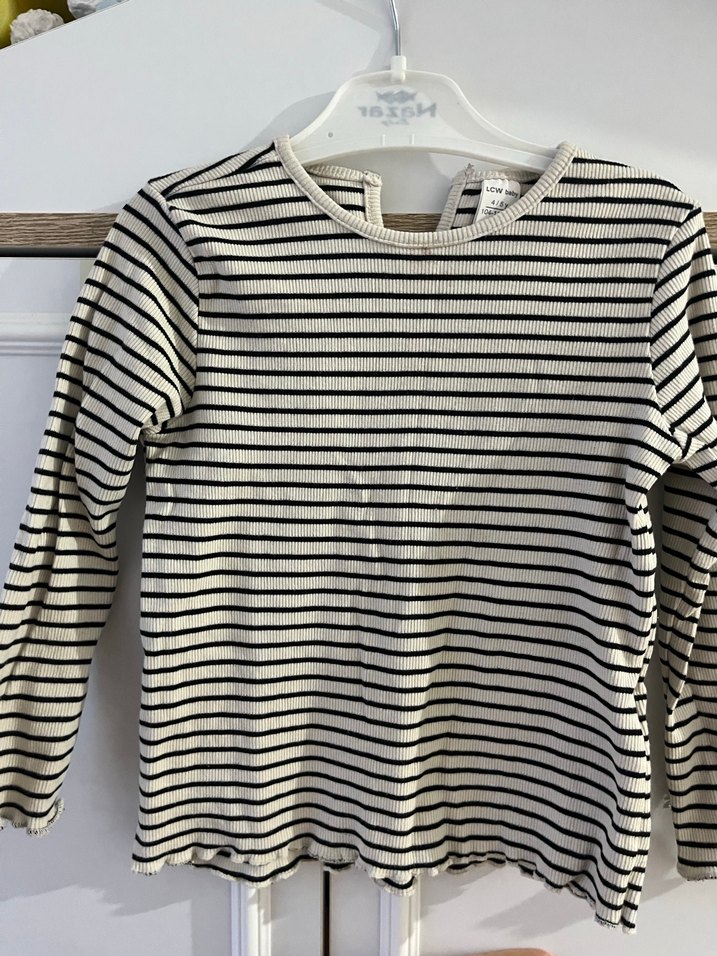 Uzun kollu, yuvarlak yakalı kız çocuk bluzu, siyah beyaz çizgili ve pile detaylıdır. Yumuşak pamuk kumaştan üretilmiştir, sokak stiline uygundur.