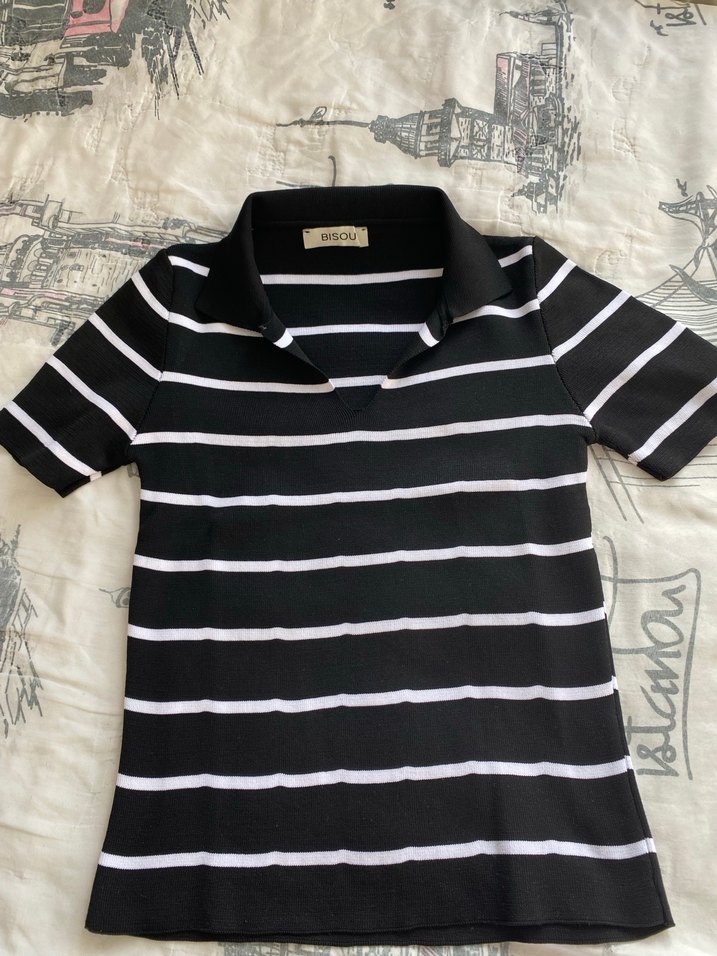 Kız çocuklar için kısa kollu, yakalı ve düğmeli, pamuklu kumaştan siyah beyaz çizgili dar kesim polo tişört. Trendy sokak giyimi için uygundur.