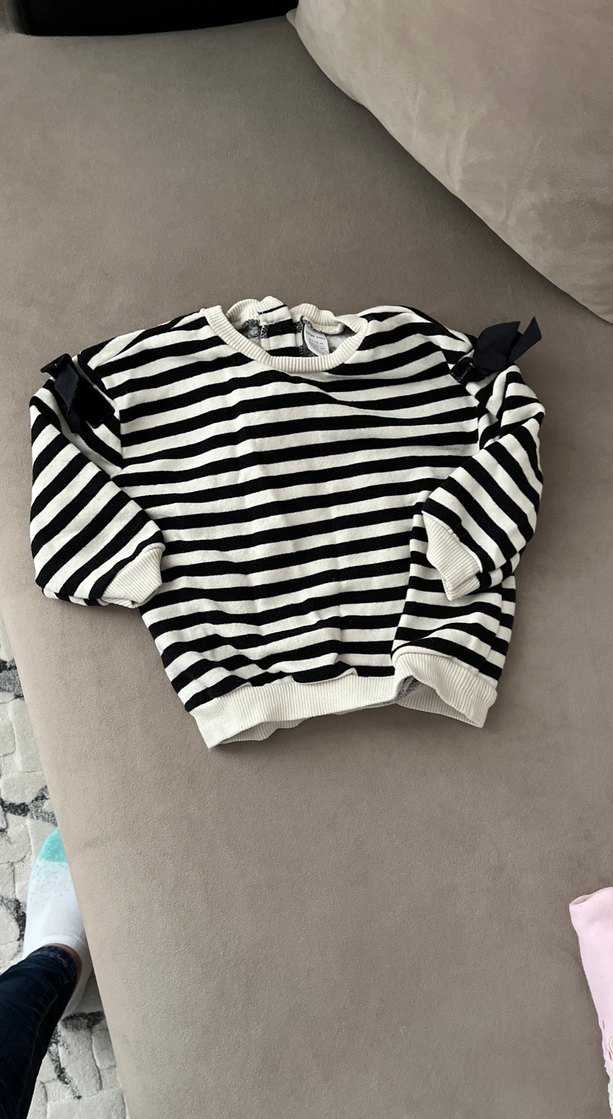 Kız çocuk için siyah beyaz çizgili, uzun kollu, yuvarlak yaka, bol kesim örme kazak. Kollarda siyah kurdele detaylı, yumuşak ve sıcak kumaştan üretilmiştir.