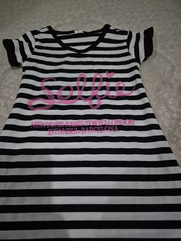 Kız çocuk kısa kollu, V yaka, yan yırtmaçlı, siyah-gri zebra desenli, pembe yazılı, sentetik kumaştan tişört.