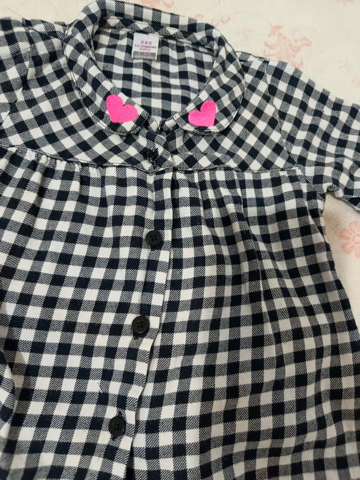 Pamuk kumaştan, uzun kollu, düğmeli, yakalı ve bol kesim kız çocuk gömleği. Siyah beyaz kareli desene sahiptir.