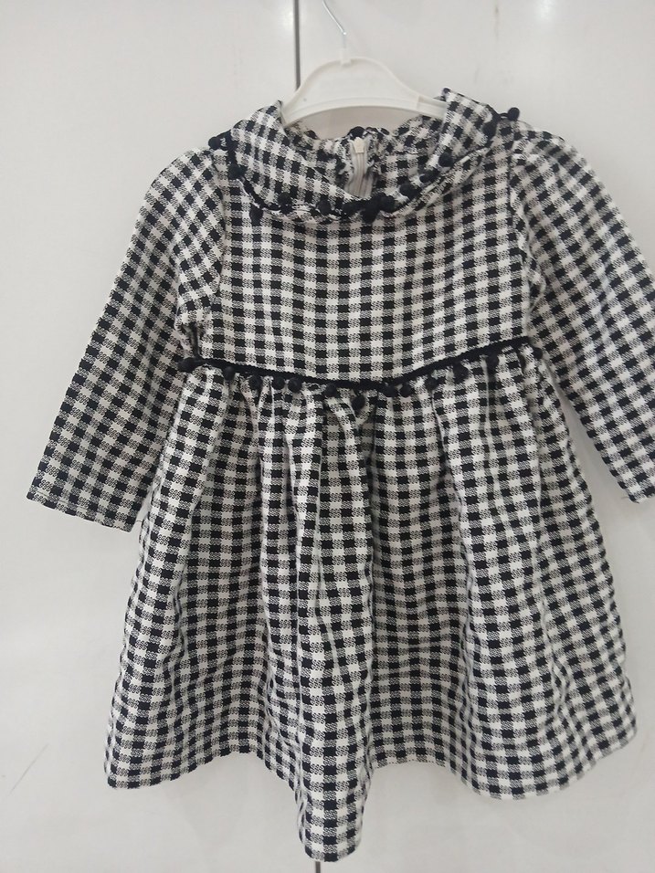 Kız Çocuk siyah Beyaz Kareli Uzun Kollu Elbise