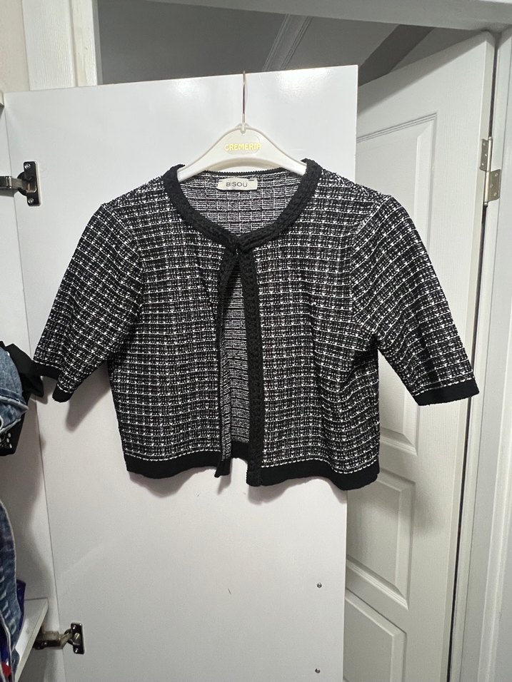 Kız çocuklar için uzun kollu, siyah-beyaz örgü desenli, dar kesim bolero. Notch yakalı, sokak stiline uygun rahat bir parça.