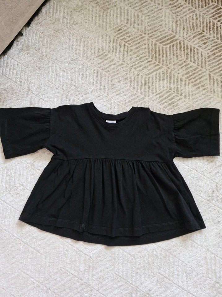 Kız çocukları için bol kesim, kısa kollu siyah bluz. Yumuşak pamuk kumaştan, hafif fırfır detaylı goth tarzı.