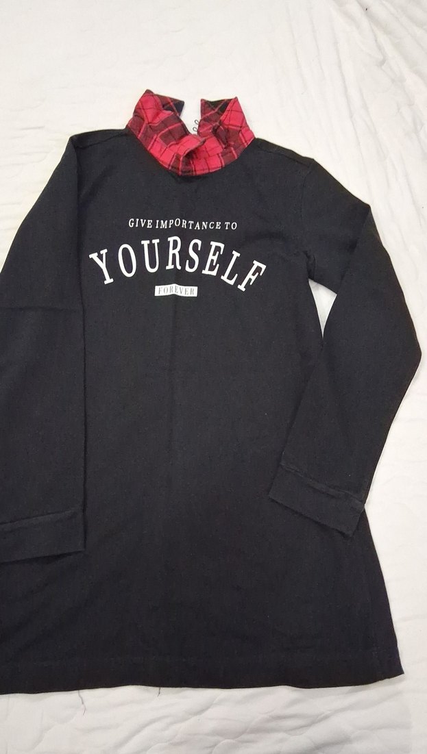 Kırmızı ekoseli boğazlı, bol kesim siyah uzun kollu kız çocuk sweatshirtü. Önünde baskılı motive edici yazı bulunmaktadır.