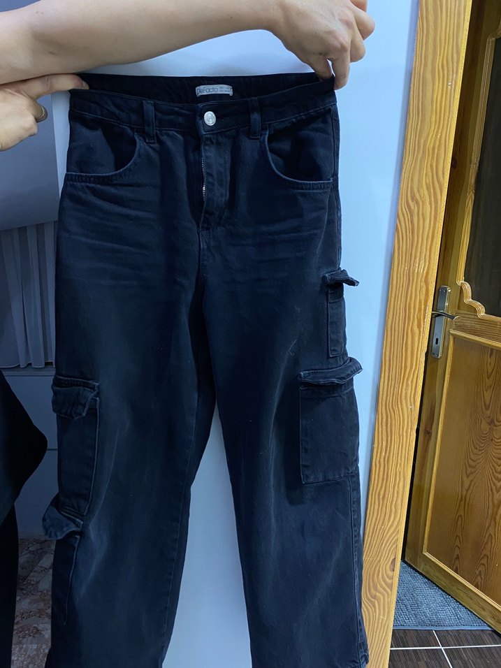 Kız çocuk için siyah denim kargo pantolon, bol kesim. Hafiften yaması var ama gozukmiyor bacak iç kısımından