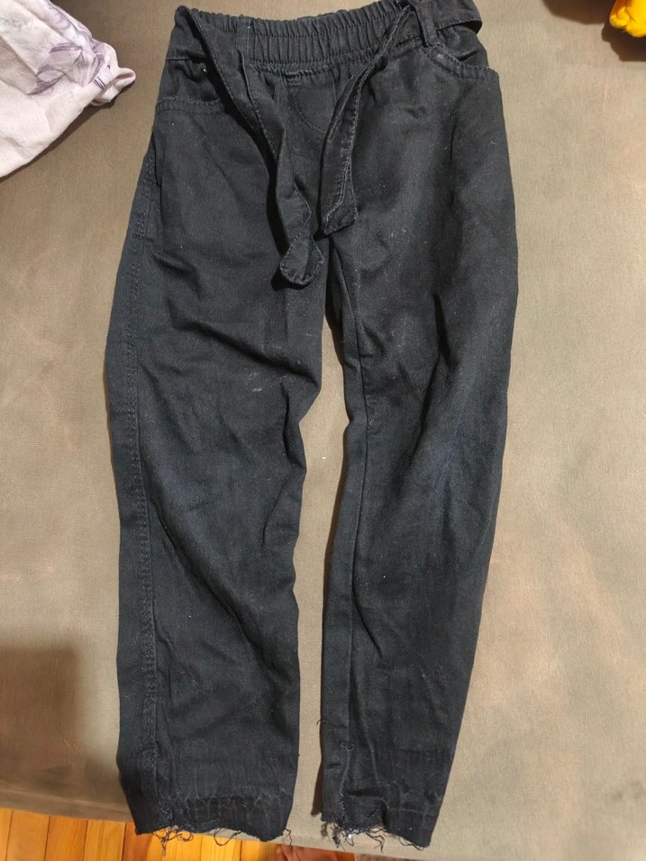 kızçocuklar için siyah bol kesim kot pantolon, kemerli bel ve düz, desensiz tasarıma sahip. Rahat ve temel stil.